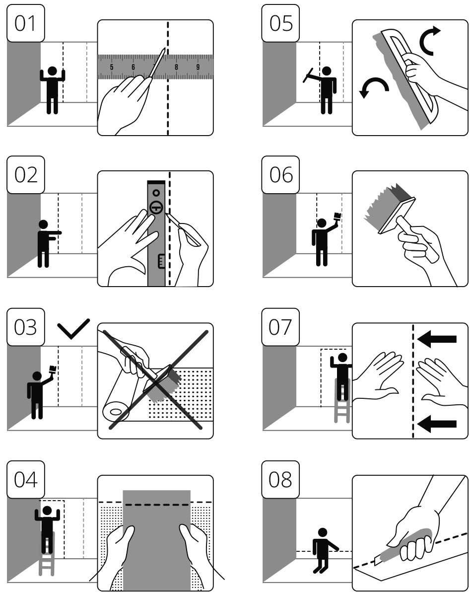 * Z dôvodu procesu sušenia lepidla sa neodporúča tapetovať v interiéri s nízkou vlhkosťou a teplotami pod 10 ° C. Optimálna izbová teplota počas tapetovania a sušenia je 18-21 °.