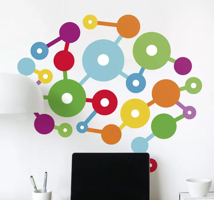 Objavte moderný a kreatívny svet dekorácie s našou Geometrickou nálepkou farebné kruhové prepojenia. Tento jedinečný dizajn je inšpirovaný abstraktnými vzormi, ktoré evokujú myšlienku mozgu a neurónov. S pestrými farbami a geometrickými tvarmi sa stane skvelým doplnkom do každého interiéru, pričom dodá priestorom štýlový a dynamický vzhľad!