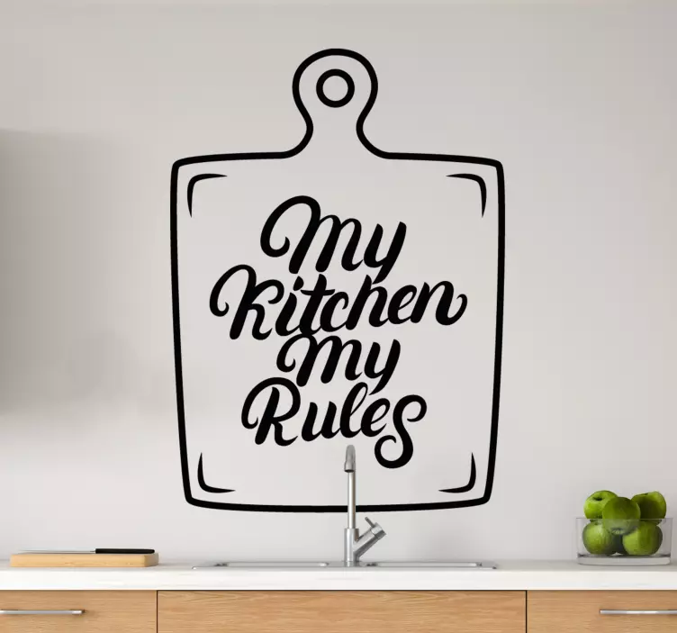 Dizajn textového nápisu na doske na krájanie, text znie „moja kuchyňa moje pravidlá“. Prevezmite kontrolu nad svojím kuchynským priestorom pomocou tohto dizajnu umiestneného na stene alebo na rovnom povrchu vášho kuchynského priestoru.