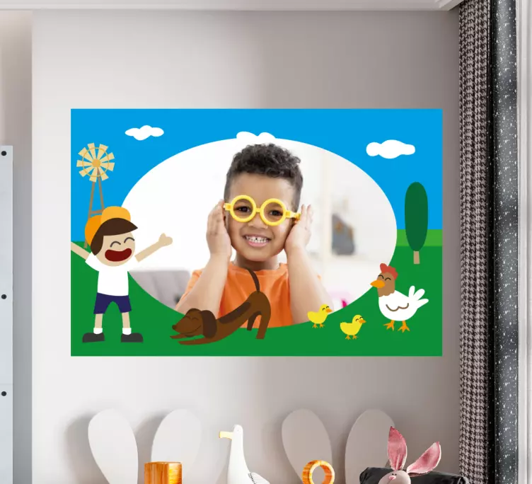 Naša nálepka pre deti hravá farmárska scéna je skvostným grafickým dielom, ktoré osloví každé dieťa. Dizajn predstavuje veselú karikatúru, v ktorej sú zobrazené deti, zvieratá a farma, čím vytvára rozprávkovú atmosféru plnú zábavy. Pestré farby a rozmarné obrázky sú dokonalým doplnkom do akéhokoľvek detského prostredia, pričom rám dodáva celému dizajnu špeciálny šarm.
