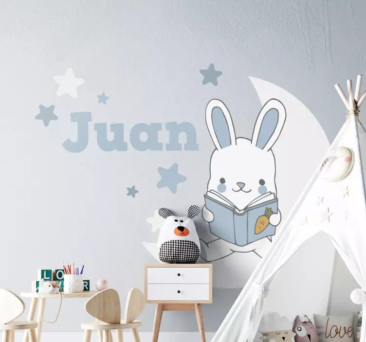 Referencia: A51047Hravý dizajn s očarujúcim zajačikom, ktorý číta knihu, obklopený hviezdami a polmesiacom. Ideálne na personalizáciu detského priestoru, tento hravý motív povzbudzuje mladých čitateľov a pridáva do izby nádych mágie.