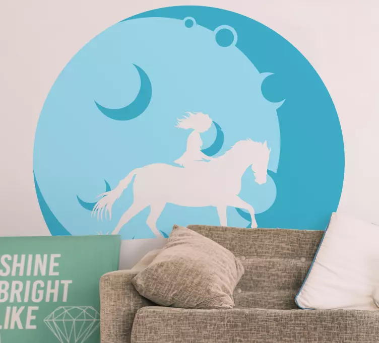 Referencia: A48385Pôvabná scéna znázorňujúca dievča jazdiace na koni proti pokojnému modrému mesiacu. Siluety vytvárajú snovú atmosféru, vyvolávajú pocity slobody a dobrodružstva. Tento dizajn zachytáva podstatu rozprávkovej cesty prírodou, ideálny na obohatenie akéhokoľvek detského izby.