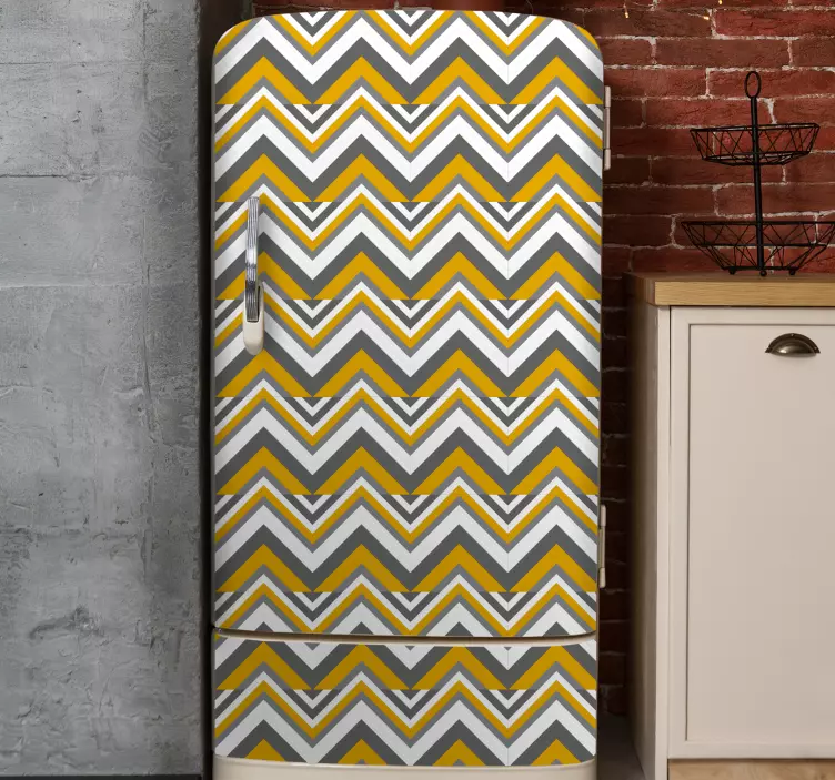 Nálepky na nábytok v chevronovom štýle predstavujú moderný a severský dizajn, ktorý sa vyznačuje cikcak vzorom trojuholníkov v žltej a sivej farebnej kombinácii. Tento jedinečný vizuálny element dodá vášmu interiéru šmrnc a štýl, pričom sa stane skvelým doplnkom na chladničku alebo iné rovné povrchy.