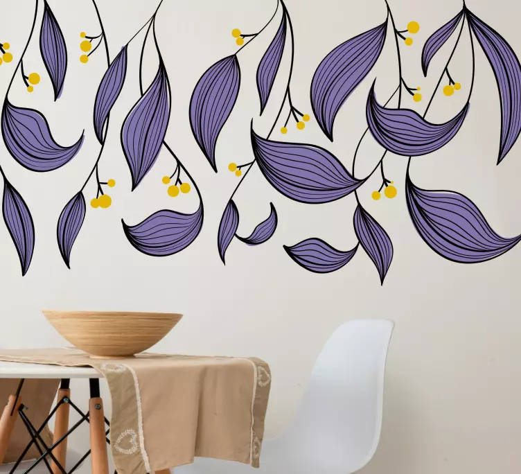 Referencia: A48215Štýlové fialové listy zdobené žltými akcentmi vytvárajú elegantné usporiadanie. Zložitá prepletenosť listov dodáva svieži a živý pocit, čo z neho robí ideálnu voľbu na oživenie obytných priestorov. Tento dizajn pridáva dotyk prírody bez toho, aby preťažil okolie.