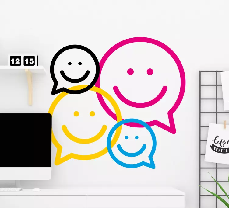 Referencia: A49042Hravé usporiadanie usmievajúcich sa tvárí rôznych veľkostí a farieb predstavuje radosť a komunikáciu. Tieto veselá ikony, stylizované s bublinkami, evokujú emócie a vytvárajú živú atmosféru, ideálnu pre priestory, ktoré sa snažia inšpirovať pozitívnosťou.