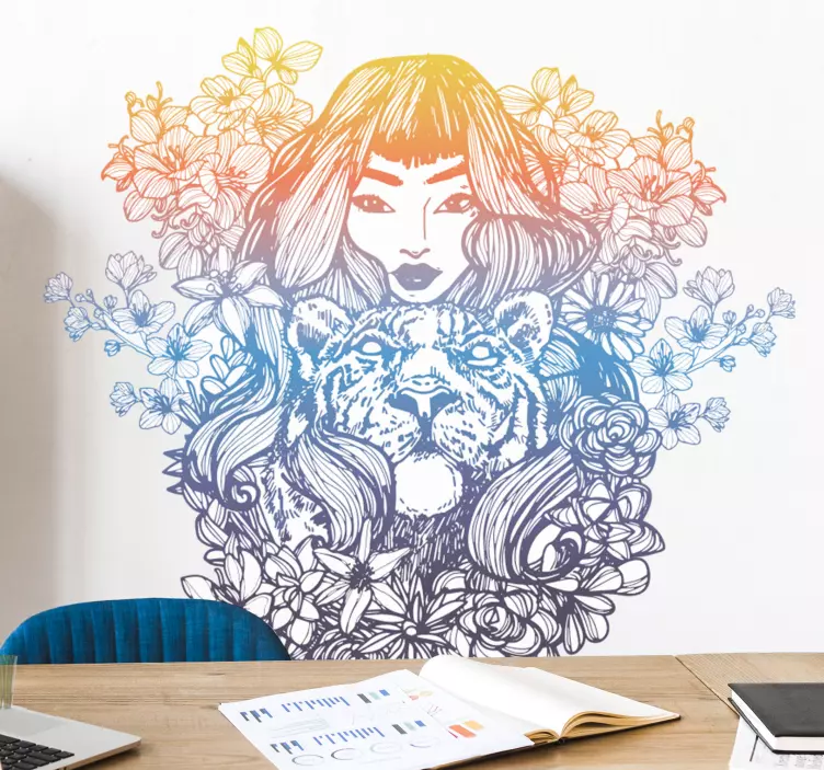 Objavte jedinečný svet umenia s našimi nalepkami na stenu zvierata Žena s tigrom, ktoré sú skutočným klenotom v oblasti interiérového dizajnu! Tento fascinujúci dizajn kombinuje keltské prvky s nádhernou ženou a majestátnym tigrom, doplnený o kvetinové motívy a krásne gradienty. S výraznými farbami a čiarovým umením dodáva táto nálepka vášmu priestoru nádych osobitosti a štýlu!