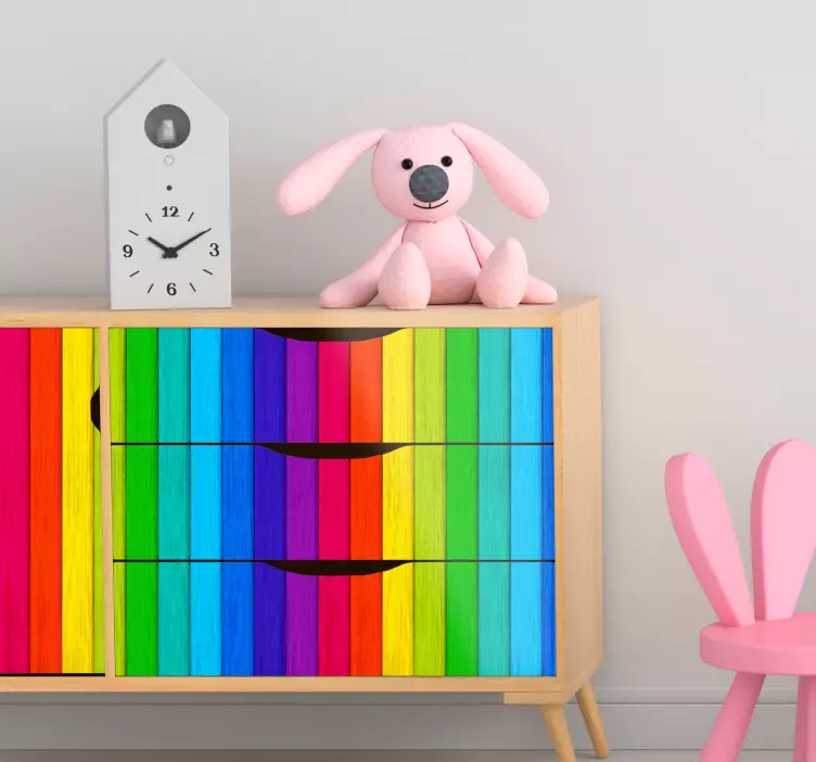 Náš produkt, nalepky na stenu zvierata žiarivé vertikálne línie, predstavuje unikátne splynutie dreveného efektu a viacfarebných pruhov, ktoré vytvárajú vibrujúci a abstraktný dizajn. Tento dizajn je ideálny na oživenie každého interiéru a dodáva mu nádych hravosti a originality. S dúhovými doskami, ktoré napodobňujú prírodný drevený vzhľad, sa stane skutočným skvostom vo vašom nábytku!
