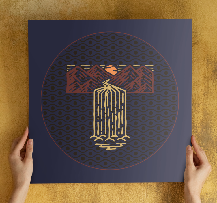 Referencia: Q7828Upokojujúca kompozícia s vodopádom, ktorý sa valí medzi stylizovanými horskými vrcholmi a zapadajúcim slnkom. Kruhový dizajn pridáva harmóniu, zatiaľ čo zložitými líniami sa evokuje pocit pokoja a spojenia s prírodným svetom.