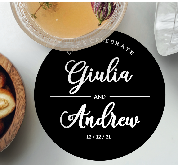 Referencia: B4267Štýlový okrúhly kúsok s personalizovanými menami páru a dátumom na pripomenutie špeciálnej príležitosti. Text zdôrazňuje oslavu, čo z neho robí dokonalý doplnok na akúkoľvek svadobnú udalosť.