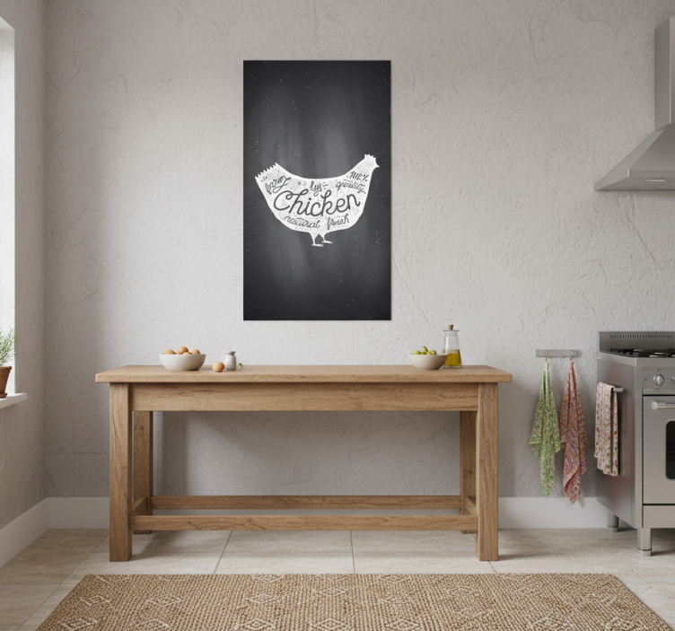Obrázok zobrazuje moderné kuchynské usporiadanie s dreveným stolom ozdobeným misou ovocia. Na stene je výrazne vystavený jedinečný plagát s kuracím mäsom, kreatívne navrhnutý s textami zdôrazňujúcimi "quality" a "freshness". Neutrálny farebný odtieň dopĺňa rustikálnu estetiku.