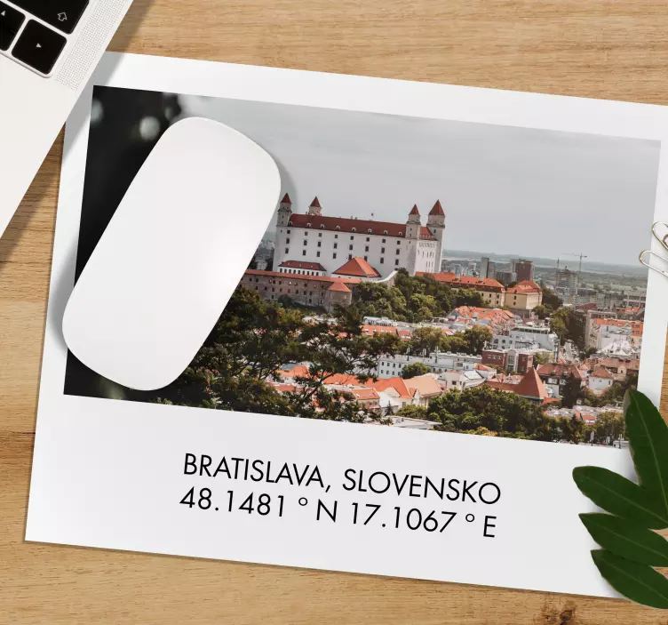 Podložka pod myš Bratislava a súradnice - Pekná dekorácia do kancelárie pre hrdého Bratislavčana. Táto PVC podložka je v tvare obdĺžnika a tvorí ju pohľad na Bratislavský hrad cez korunu stromov. Na fotografii je vidno ostatné meštianske budovy a nad mestom je obloha s oblakmi. Dookola je biely rám a pod obrázkom nápis "Bratislava" a súradnice s polohou mesta. Podložka Bratislava a súradnice je vyrobená z veľmi kvalitného vinylu, aby vydržala po celé roky a nechala si svoj vzhľad. A údržba je tiež veľmi jednoduchá. Všetky nečistoty stačí len zotrieť mokrou handrou. Prispôsobte si text a zvloľte ideálnu veľkosť na Váš pracovný stôl. Objednávka online s doručením kdekoľvek na svete!