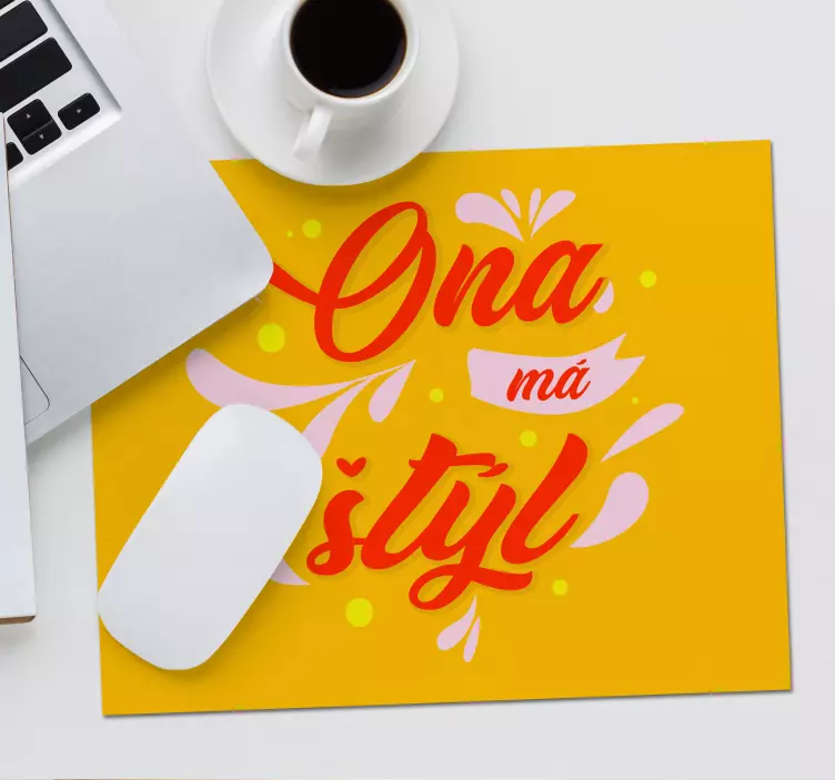 Podložka pod myš Ona má štýl s textom známej Slovenskej pesničky. Na PVC podložke je motív s nápisom v troch riadkoch. Nápis je v troch riadkoch hrubým, ozdobným písmom v znení "Ona má štýl". Slovo "má" je v čiernom ráme. Dookola sú nakreslené kvapky a bodky. Písmená sú v červenej farbe s doplnakmi v bielej a žltej. Podložka Ona má štýl je vyrobená z veľmi kvalitného vinylu, aby vydržala po celé roky a nechala si svoj vzhľad. A údržba je tiež veľmi jednoduchá. Všetky nečistoty stačí len zotrieť mokrou handrou. Prispôsobte si text a zvloľte ideálnu veľkosť na Váš pracovný stôl. Objednávka online s doručením kdekoľvek na svete!