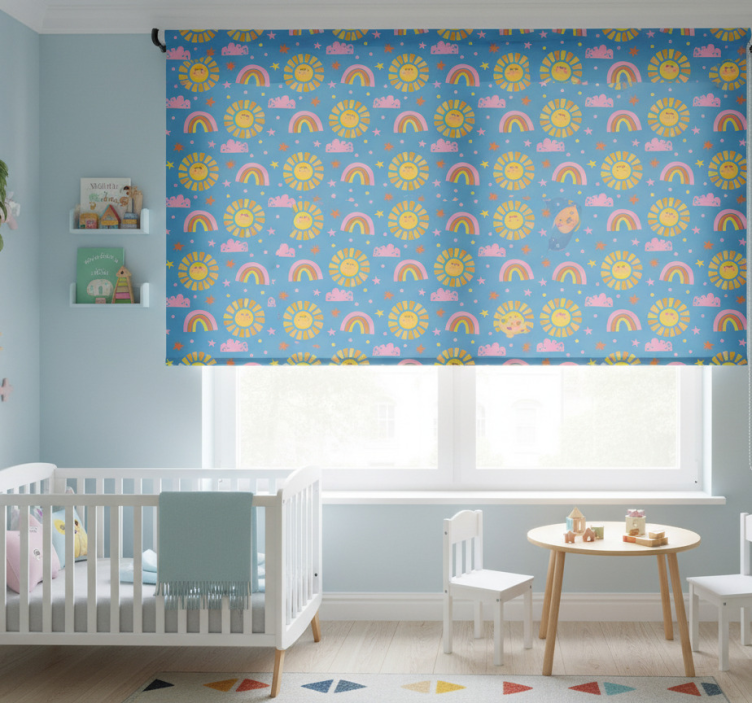 Farebné slnka sa žiarivo usmievajú na živom modrom pozadí, doplnené hravými dúhami a nadýchanými oblakmi. Hviezdy žiaria po celom dizajne, pridávajúc nádych kúzla. Tento veselý vzor evokuje pocit radosti a úžasu, ideálny na oživenie akéhokoľvek priestoru sviežou a príjemnou atmosférou.