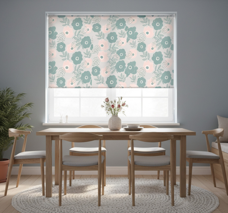 Roleta do jedálne s kvetmi v ružovej a modrej