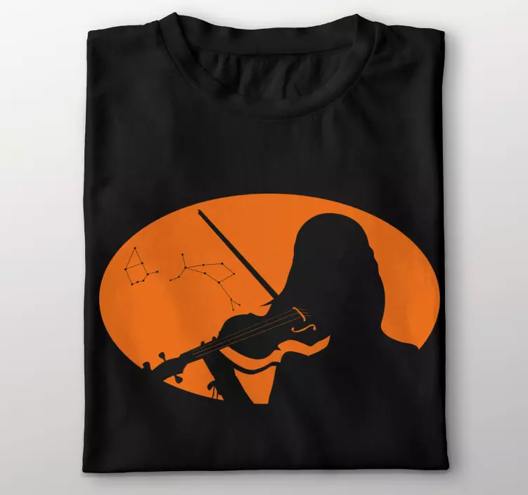 Referencia: T4530Tento pôsobivý dizajn zobrazuje siluetu huslistu pod hviezdnou oblohou s konšteláciami v pozadí. Žiarivý oranžový kruh krásne kontrastuje s čiernou látkou, čo z neho robí ideálnu voľbu pre milovníkov hudby. Ideálne na špeciálne príležitosti alebo na bežné nosenie.
