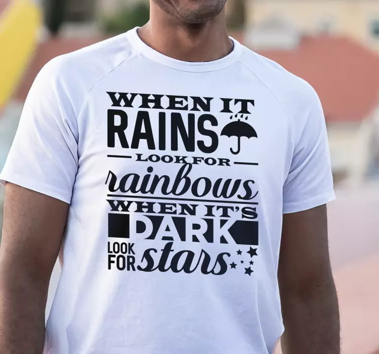 Referencia: T4888Tento štýlový top obsahuje povzbudzujúcu frázu, ktorá podporuje pozitívne myslenie. Dizajn inteligentne kombinuje obrázky dažďa, dúh a hviezd, čo z neho robí premyslenú voľbu pre kohokoľvek, kto hľadá motiváciu v náročných časoch.