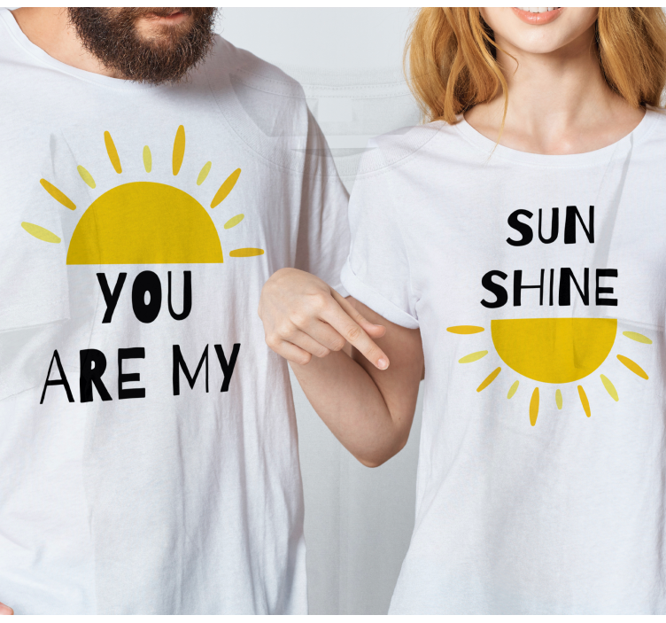 Referencia: T5107Tento pôvabný dizajn zobrazuje pár, ktorý má na sebe zladené tričká zdobené veselými slnečnými motívmi a teplými, láskyplnými frázami. Slnečné farby vyvolávajú pocity radosti a spojenia, čo z neho robí dokonalú voľbu na vyjadrenie lásky v príjemnom štýle.