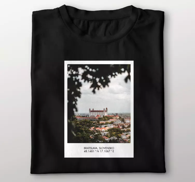 Tričko Bratislva a súradnice - orihinálny vzor pre každého hrdého Bratislavčana. Tento produkt má obrázok v tvare obdĺžnika a tvorí ho pohľad na Bratislavský hrad cez korunu stromov. Na fotografii je vidno ostatné meštianske budovy a nad mestom je obloha s oblakmi. Dookola je biely rám a pod obrázkom nápis "Bratislava" a súradnice s polohou mesta. Bratislava tričko so súradnicami si viete vybrať v rôznych veľkostiach dokonca aj strihoch na základe toho či to je pre muža alebo ženu. Prípadne si objednajte strih pre svoje dieťa! Navyše je z kvalitného materiálu takže toto originálne tričko vydrží naozaj dlho! Hlavné a vedľajšie cesty sú zvýraznené a okolo mapy je elegantné čierne orámovanie. Farby na tričku sú opačné takže obrázok s mapou na tričku je veľmi štýlový.