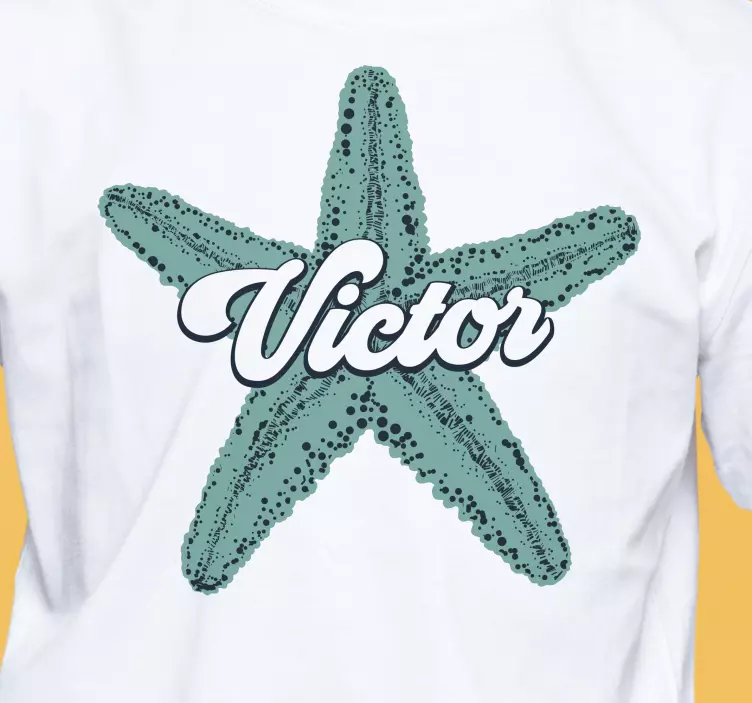 Referencia: T5389Tento dizajn obsahuje pôvabnú hviezdicu v odtieňoch teal s elegantne integrovaným menom Victor. Hravá estetika je ideálna pre nadšencov oceánu, pričom pridáva osobný dotyk, ktorý vyniká. Ideálne pre tých, ktorí chcú vo svojom oblečení prijať prímorskú atmosféru.
