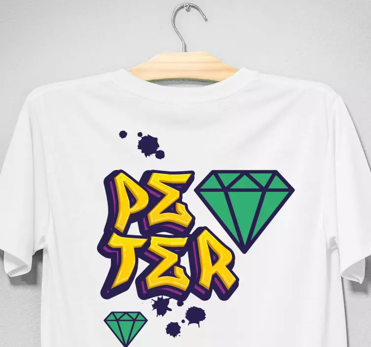 Referencia: T5428Tento živý dizajn zobrazuje meno 'Peter' v tučných, štýlových písmenách vedľa grafiky zeleného diamantu. Hravejšie prvky zahŕňajú farebné škvrny, ktoré posilňujú moderný pocit. Ideálne na neformálne nosenie, kombinuje jedinečné umenie s osobným dotykom.