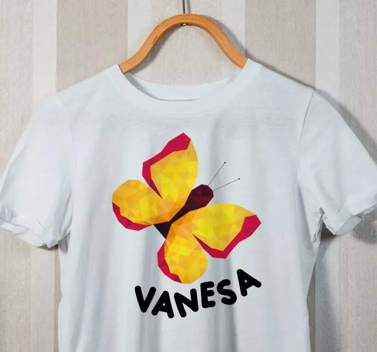 Referencia: T4993Tento pôvabný dizajn zobrazuje živú motýľ s oslnivou kombináciou žltých a červených odtieňov. Geometrické tvary pridávajú moderný nádych, zatiaľ čo tučné písmo mena zvyšuje jeho osobný pôvab. Ideálne na vystihnutie veselého a hravého dojmu.