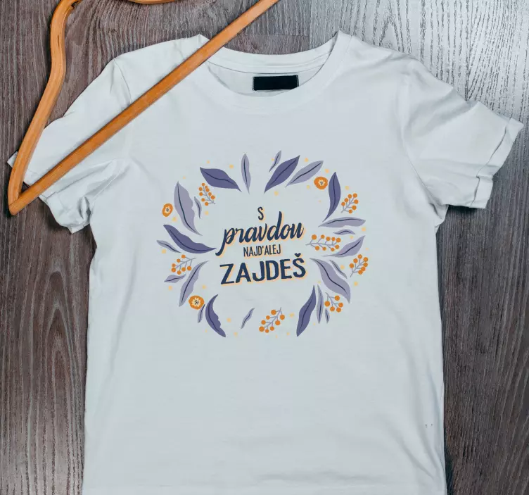 Ozdobné tričko S pravdou najďalej zájdeš - oblečenie s milým nápisom. Produkt obsahuje jednoduchý citát o pravde napísaný rôznymi štýlmi písma a rozdelený do troch riadkov. Slová "pravdou" a "ZÁJDEŠ" sú hrubo zvýraznené. Okolo textu sú ozdobné prvky v podobe listov a kvetov. Orámovanie má tvar kruhu vo farbách ako modrá, oranžová alebo sivá. Vysoká kvalita spracovania zaručuje, že tričko S pravdou najďalej zájdeš si ponechá svoj krásny vzhľad veľmi dlhú dobu pre svojho majiteľa. Na výber sú modely pre mužov aj ženy. Produkty vyrábame vo vysokej kvalite, aby sme zaručili spokojnosť všetkých našich zákazníkov. Vyberte si svoju veľkosť, obľúbenú farbu a objednajte online s doručením domov!