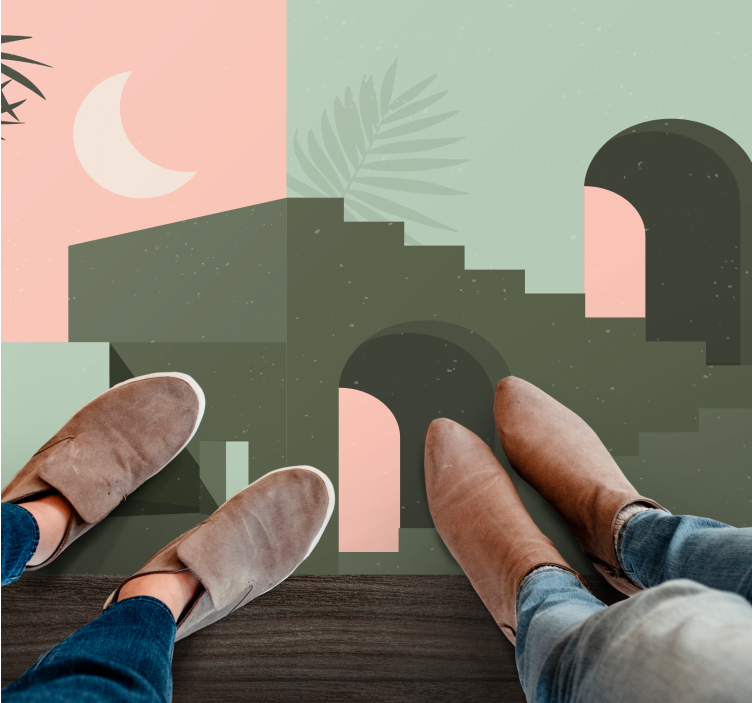 Referencia: R11884Abstraktná reprezentácia s minimalistickými architektonickými siluetami na pozadí pastelových farieb. Scéna zahŕňa geometrické tvary pripomínajúce budovy a arkády, s jednoduchým zobrazením palmy a polmesiaca.