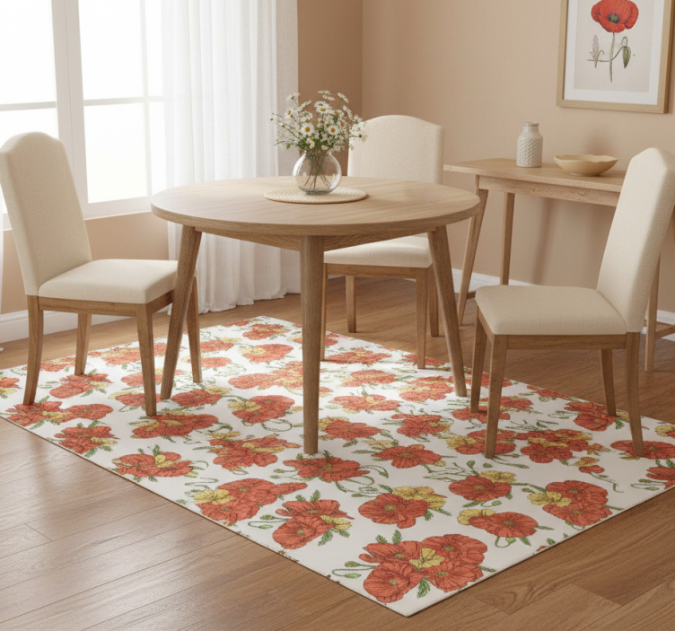 Naša vinylový koberec s kvetmi je ideálnym riešením pre tých, ktorí chcú pridať do svojich interiérov štipku farby a životného ducha. Vinylový koberec s kvetmi makov na bielom pozadí nielenže ozdobí vašu podlahu, ale aj vytvorí útulnú atmosféru, ktorá povzbudí vašu kreativitu a pohodu. Jeho jedinečný dizajn a praktické vlastnosti z neho robia skvelý doplnok do obývačky, spálne aj detskej izby!