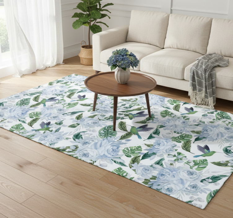 Údržba vinylového koberca s kvetmi je veľmi jednoduchá. Stačí ho pravidelne zametať alebo otierať vlhkou handričkou, aby ste zachovali jeho krásny vzhľad. Vinylový koberec s kvetmi modrých záhradných kvetov s vtákmi je odolný voči škvrnám, takže sa nemusíte obávať, že by sa rýchlo znečistil.